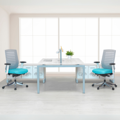 - Espacio de trabajo amplio y organizado para equipos de dos personas.