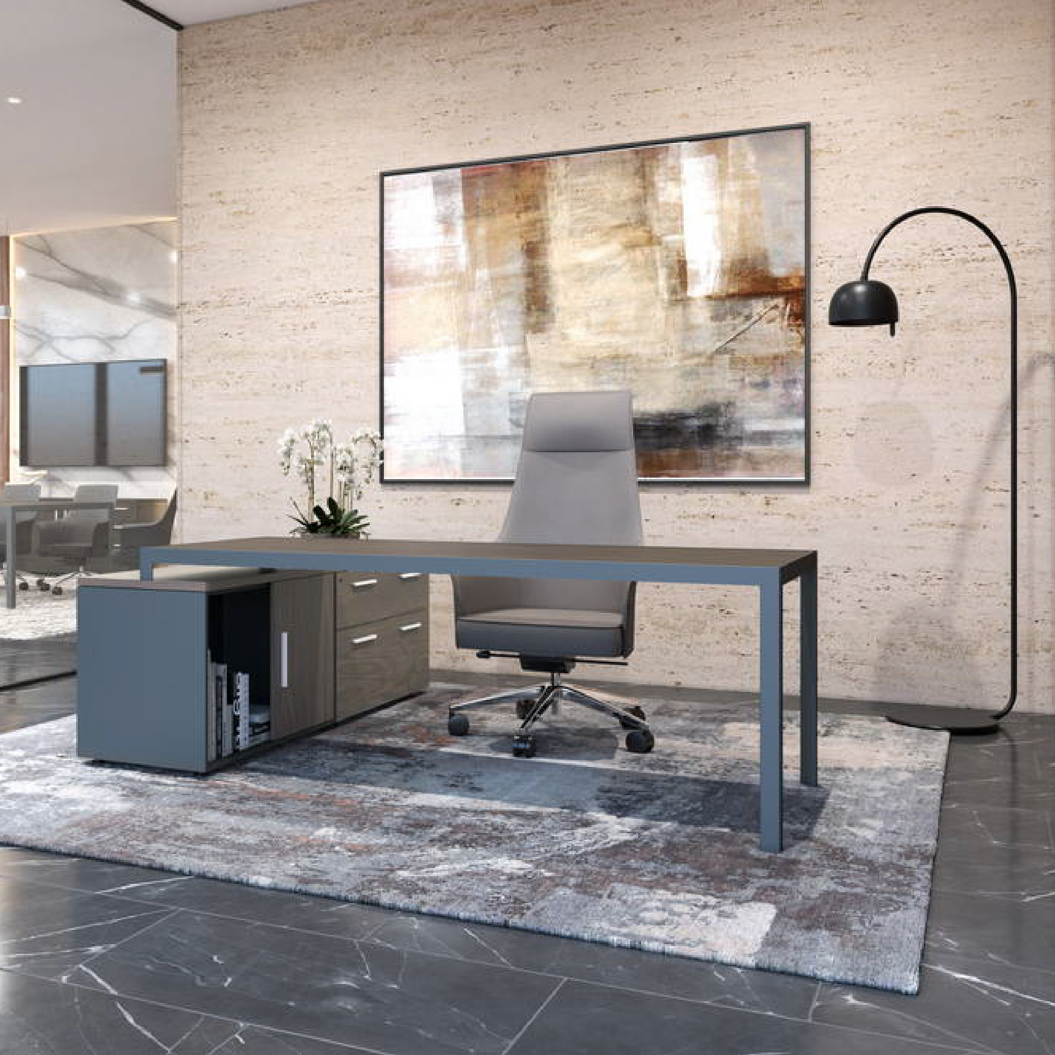 Su estructura perimetral de aluminio y patas de acero en color antracita aportan un toque moderno y profesional, ideal para oficinas ejecutivas y despachos.