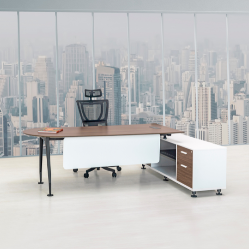 Su diseño ergonómico en forma de L tipo bala permite una distribución óptima del espacio, maximizando la comodidad del usuario y mejorando la productividad. La credenza lateral integrada proporciona almacenamiento eficiente para mantener documentos y herramientas organizadas, logrando un entorno de trabajo ordenado.