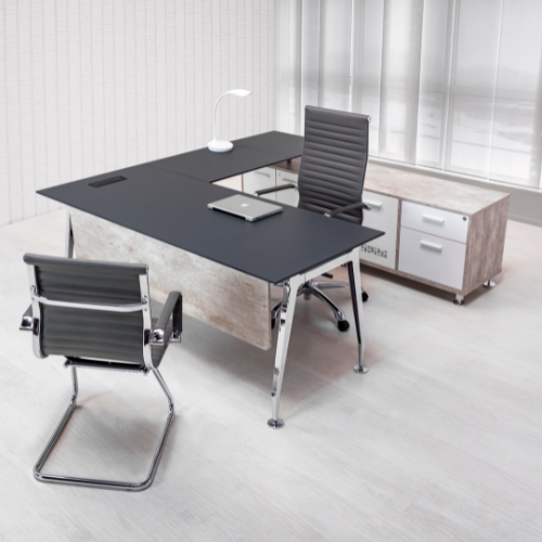 Este escritorio en forma de L es la elección perfecta para quienes buscan un equilibrio entre estética moderna y practicidad, adaptándose a oficinas ejecutivas, despachos o estudios creativos.