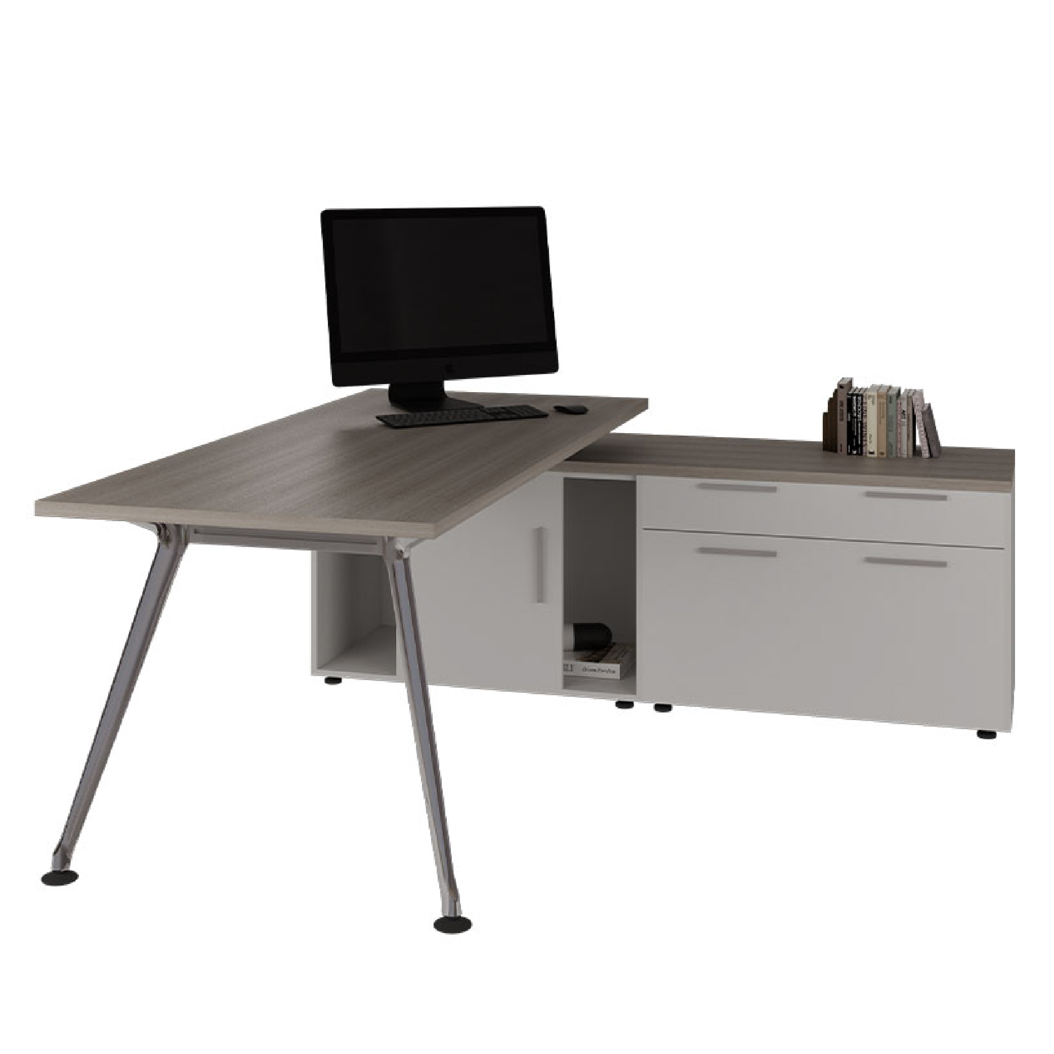 Transforma tu oficina en un espacio moderno y eficiente con el Escritorio en L con Credenza Lateral Z/Chrome.