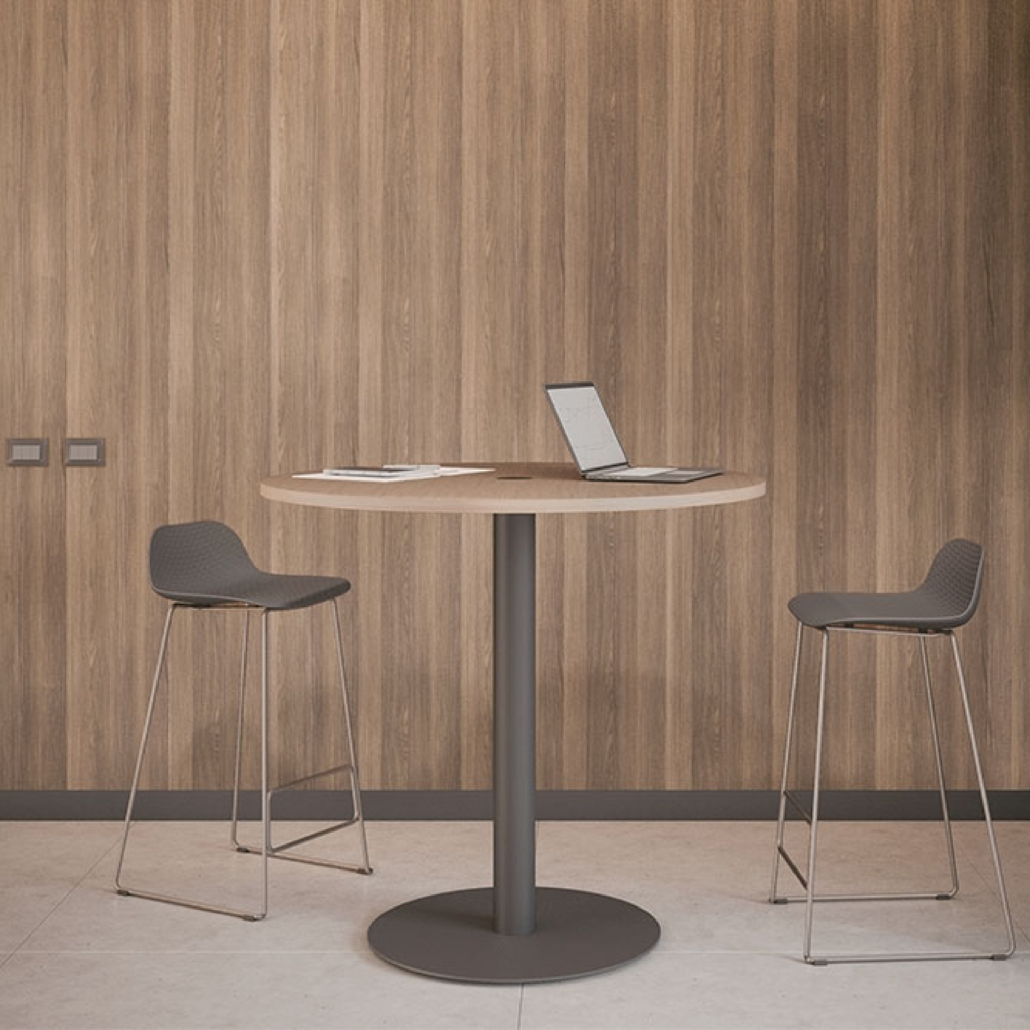 La Mesa Connect Alta ofrece diseño y funcionalidad en una altura de 1.10 metros, ideal para oficinas dinámicas, espacios colaborativos o salas de reuniones informales. Su base de plato con poste vertical electrificable permite una integración tecnológica sencilla, haciendo que conectar tus dispositivos sea práctico y eficiente.